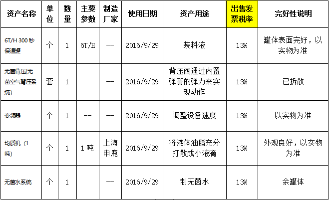 受委托,我公司將于2021年11月25日下午10時(shí)在金拍網(wǎng)平臺(tái)https://www.jinpaiwang.com.cn以網(wǎng)絡(luò)競(jìng)價(jià)的方式公開處置保溫罐、變頻器、均質(zhì)機(jī)、無菌水系統(tǒng) 等一批設(shè)備,設(shè)備未裝箱,完好。